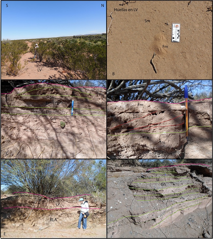 Fig. 9. Elementos arquitecturales de la llanura de inundación y área intercanal de la zona 2. A. Vista general de los albardones (LV); B. Detalle de huellas y litologías de los albardones; C-D. Detalle de litofacies de los albardones; E-F. Vista general de las áreas de intercanal y detalle de litofacies que los componen. La ubicación espacial de los elementos y su morfología en planta pueden observarse en la figura 5. La descripción de las litofacies mencionadas en la figura se encuentra en la tabla 1. LV: albardón, BLA: barra longitudinal arenosa.