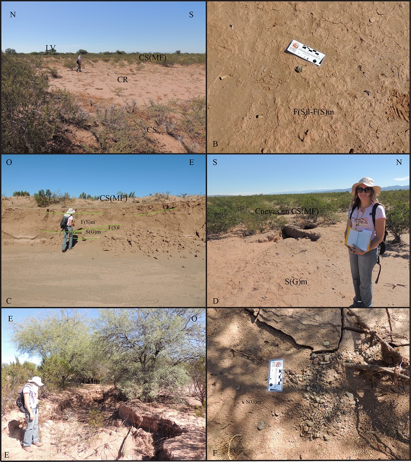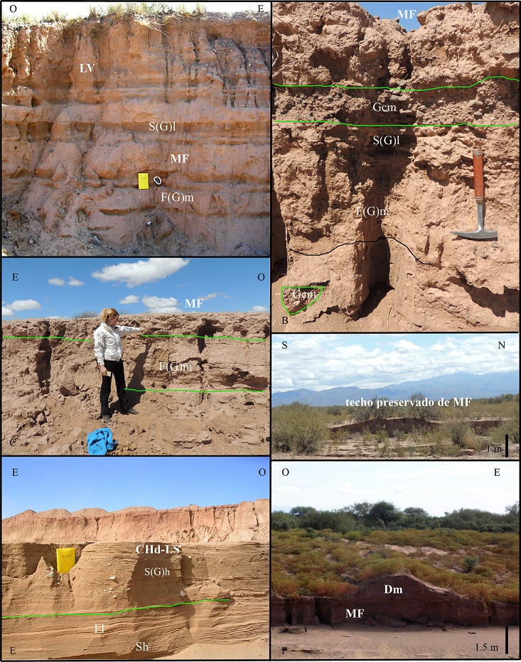 Fig. 12. Principales elementos arquitecturales de la llanura de inundación de la zona 3. A. Albardones (LV); B-C. Perfil y vista general de lóbulos terminales (MF), nótese el arreglo granocreciente; D. Morfología convexa del techo de los lóbulos terminales; E. Canales secundarios que irrigan la llanura de inundación (CHd-LS); F. Dunas menores (Dm) y su relación espacial con otros elementos (MF). La ubicación espacial de los elementos y su morfología en planta pueden observarse en la figura 5. La descripción de las litofacies mencionadas en la figura se encuentra en la tabla 1.