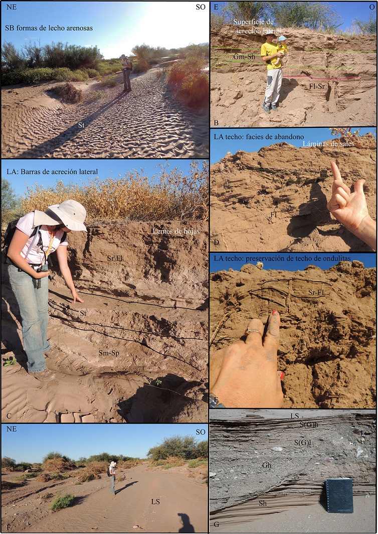 Fig. 11. Principales elementos arquitecturales de la faja de canales de la zona 3. A. Formas de lecho arenosas SB; B-C. Perfiles de las barras de acreción lateral (LA); D-E. Detalle de las litofacies del techo de las barras LA; F. Elemento mantos de arenas laminadas (LS), nótese los árboles y arbustos diseminados por el lecho fluvial; G. Perfil del elemento LS y litofacies que lo componen. La ubicación espacial de los elementos y su morfología en planta pueden observarse en la figura 5. La descripción de las litofacies mencionadas en la figura se encuentra en la tabla 1.