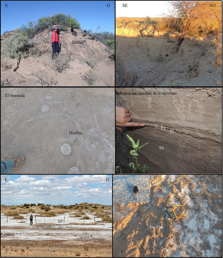 Fig. 13. Principales elementos arquitecturales de la zona 4. A. vista general de las dunas (D); B. Perfil de dunas (D); C. Elemento interduna húmeda (ID) donde se observan huellas preservadas; D. Perfil del elemento interduna (ID); E. Vista general de los elementos dunas (D) y lagunas de fangos salinos (SP); F. Detalle de litofacies en lagunas de fangos salinos. La ubicación espacial de los elementos y su morfología en planta pueden observarse en la figura 5. La descripción de las litofacies mencionadas en la figura se encuentra en la tabla 1.