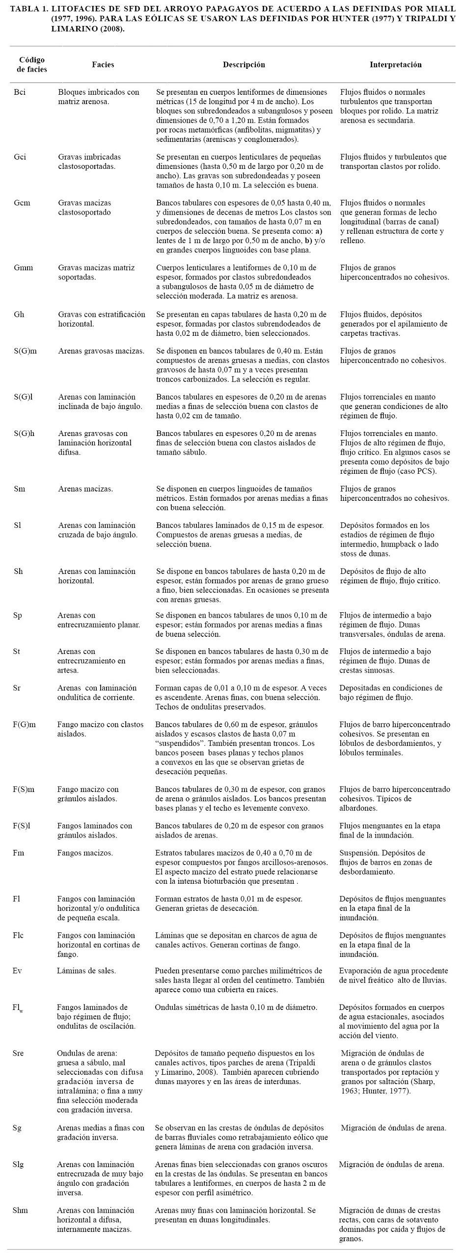 Teniendo en cuenta el procesamiento de las imágenes satelitales, sumado a controles de campo, se realizó un mapa sedimentológico-geomorfológico detallado del arroyo Papagayos. Se identificaron y estudiaron desde el punto de vista sedimentológico las siguientes geoformas fluviales: canales principales, canales secundarios, diferentes tipos de barras fluviales, formas de lecho, y elementos de la llanura de inundación como albardones, lóbulos de desbordamiento, charcas, canales secundarios alimentadores de llanura de inundación y dunas. Estas geoformas fueron analizadas como elementos arquitecturales dentro del sistema distributario fluvial y en cada una de ellas se relevaron transectas sedimentológicas detalladas, describiéndose perfiles en las caras libres de las mismas, aplicando las metodologías de Allen (1983) y Miall (1996) (Tabla 1). Los elementos arquitecturales fueron definidos de acuerdo a su disposición espacial, morfología, arquitectura facial y jerarquía de superficies limitantes que los conforman (Miall, 1985, 1996). De acuerdo con Allen (1983) y Miall (1996) las superficies de 1° y 2° orden limitan sets y cosets, respectivamente; las superficies de 3° orden indican reactivación de las corrientes fluviales, que producen modificaciones en el régimen de flujo pero no en el estilo de las macroformas. Para las superficies de 4° orden, se utilizó la acepción de Tripaldi et al. (2001), quien divide la superficie de cuarto orden en tres reconociéndose las superficies 4a, que describe el límite superior de macroformas con morfología preservada, resultando generalmente planas o convexas hacia arriba (Miall, 1988, 1996); las 4b, cóncavas hacia arriba o irregulares, que marcan las superficies basales de canales individuales incluidos en complejos de canales, y las 4c, irregulares o planas, como aquellas que limitan depósitos de canales menores o lóbulos de desbordamiento dentro de la planicie de inundación. Finalmente, se identificaron como superficies de 5° orden las que limitan complejos de canales o grandes canales multiepisódicos (Miall, 1996).