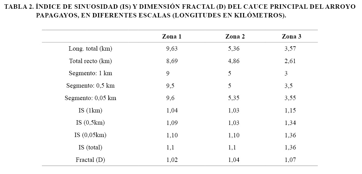 Por otra parte, se obtuvieron parámetros morfológicos de los distintos sectores del arroyo Papagayos para obtener una mejor caracterización del mismo. La sinuosidad del canal fue analizada siguiendo la metodología de Gumbricht et al. (2004) que consiste en analizar la variación de estos parámetros en diferentes escalas. En este caso se consideraron cuatro escalas de trabajo tomando segmentos de 2,1, 0,5 y 0,05 kilómetros. A través del SIG se obtuvieron las longitudes totales de los tramos. El cálculo de la sinuosidad se hizo a través de IS=thalweg/longitud del valle (Leopold y Wolman, 1957) para cada segmento, y se calculó la dimensión fractal del cauce principal para compararlo con el clásico IS (Gan et al., 1992). También se obtuvo la relación ancho/profundidad de los cauces activos a lo largo de los distintos sectores identificados en el SFD dentro del arroyo Papagayos.