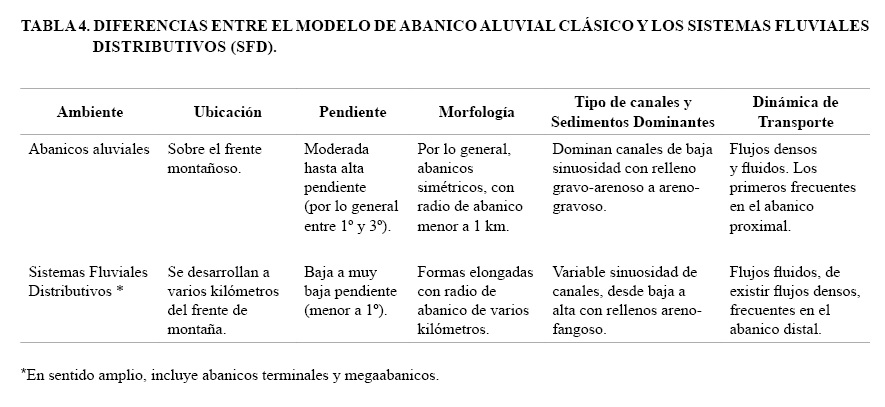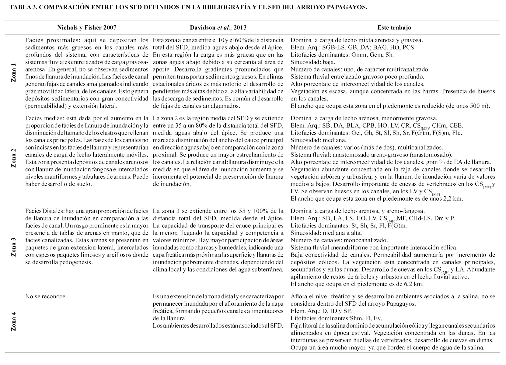 El arroyo Papagayos presenta una red de drenaje divergente aguas abajo que desarrolla un cono de depósitos con morfología de abanico alejado del frente montañoso, en este caso a 12 km de distancia, aspectos que permiten identificar este sistema como un SFD (Hartley et al., 2010). Además, se suman otras características distintivas de los SFD observadas en este ambiente sedimentario como (Tabla 3): a) el dominio de flujos canalizados no viscosos a lo largo de todo el sistema, b) el reconocimiento de una zonación aguas abajo: proximal, media y distal, c) el aumento de la sinuosidad de los sistemas de canales aguas abajo, d) el aumento de número de canales aguas abajo y la disminución del tamaño de los mismos y e) la disminución de la capacidad y competencia de las corrientes tractivas (Nichols y Fisher, 2007; Weissmann et al., 2010; Hartley et al., 2010).