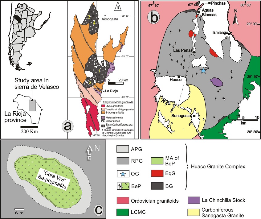 Fig. 1. a. Simplified geologic map of the sierra de Velasco (taken to Grosse et al., 2011); b. Geological map of the study area, NW Argentina, modified from Sardi et al. (2010); c. Cora Vivi Be-Pegmatite as example to show specifically the APG and MA facies. RPG: Regional Porphyritic Granite; BG: Border Granite; APG: Adjacent Porphyritic Granite; BeP: Be-pegmatite;MA: Marginal Aplite of the Be-Pegmatite; EqG: Equigranular Granites; OG: Orbicular granite; LCMC: La Cébila Metamorphic Complex.