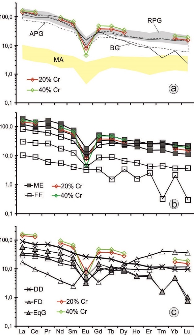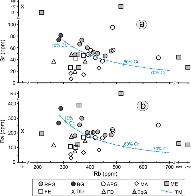 Figure 9 show the hypothetical Rb, Sr and Ba compositions in the calculated liquid according to the Rayleigh fractionation model. Comparison between the theoretical compositions and the samples show a correlation for the BG, RPG and APG, whereas the MA, ME, FE, DD, FD and EqG plot away from the theoretical curves, mostly below them. Therefore, we propose that the coeval RPG, BG and APG facies are related to each other by a fractional crystallization process, whereas the other facies and associated rocks were not involved in this process. The REE compositions also show correlation with the fractional crystallization model for the coeval RPG-BG-APG facies, which furthermore have a notable parallelism in the normalized-diagrams (Fig. 10a). Probably due to high contents of REE-fractionated minerals (e.g., biotite), the ME plot close to the theoretical model, but we cannot suggest any relation with the main facies by means of this process, at least given the geochemical data (Fig. 10b). The other facies and associated rocks seem to have no relationship with the fractional crystallization model (Fig. 10a, b, and c).