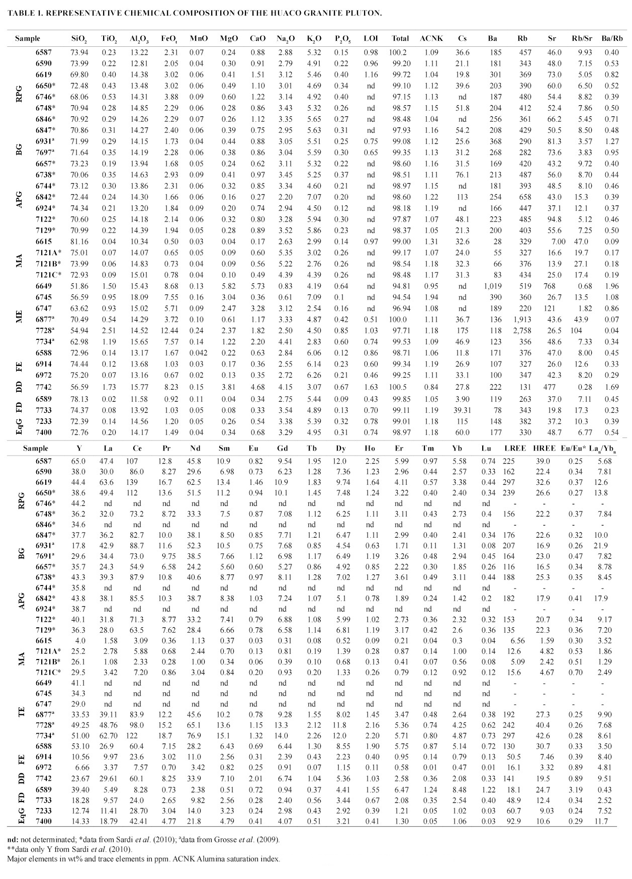 Geochemical analysis is based on 35 representative samples of the different facies of the Huaco granite pluton and associated magmatic rocks: 8 of the RPG; 2 of the BG; 7 of the APG; 4 of the MA; 6 of the ME; 3 of the FE; 1 of the DD; 2 of the FD and 2 of the EqG. The analyses were performed at the laboratories of IGME (Instituto Geominero de España), Naruto University of Education (Japan), Huelva University (Spain) and ACTLAB (Canada). Major elements were determined by XRF, and trace elements by ICP-MS/AES. The analyses are shown in table 1, and include our new data (n=8) together with previously unpublished analyses of Grosse (2007; n=7) and published data of both Grosse et al. (2009; n=5) and Sardi et al. (2010; n=15).