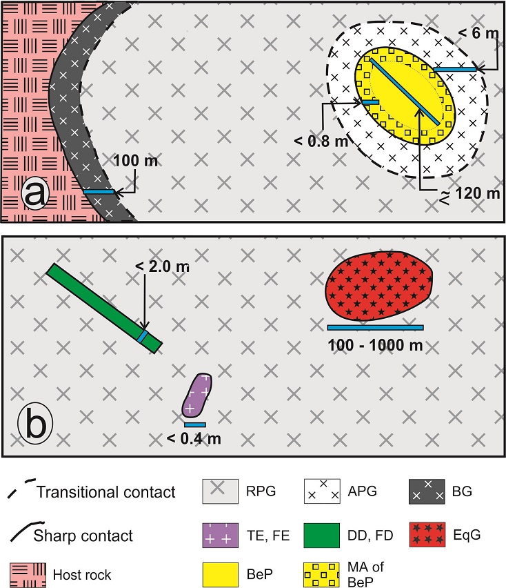 Based on field observations, petrography, LIL and REE compositions, the main and coeval facies formed by fractional crystallization from the main magma in the sequence BG-RPG-APG, from the wall towards the interior of the chamber and finally around the Be-pegmatites.