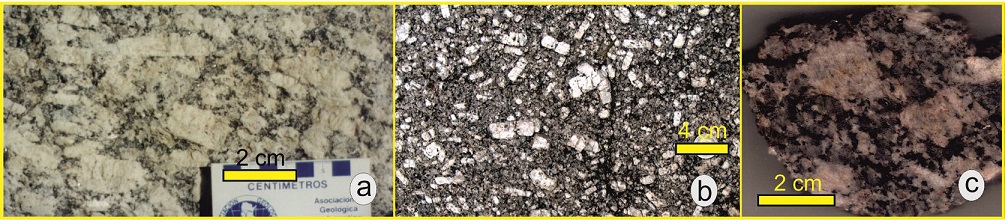 Orbicular Granite (OG): it is a small (65x15 m), irregularly shaped body located in the central part of the Huaco pluton (Fig. 1b). It has been studied by Quartino and Villar Fabre (1962) and Grosse et al. (2010). The OG consists of ellipsoid-shaped orbicules of 3 to 15 cm immersed in an aplitic-pegmatitic matrix. The orbicules consist of a core formed by a K-feldspar megacryst, partially to totally replaced by plagioclase, and alternating layers of radial and plumose plagioclase crystals and tangentially oriented biotite rings (Grosse et al., 2010). Grosse et al. (2010) conclude that the orbicular granitoid formed in situ in a pocket of evolved and volatile-rich melt segregated from the surrounding partially crystallized Huaco granite, possibly via a filter pressing mechanism.