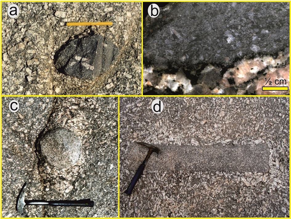 Felsic Enclaves (FE): these enclaves can reach 2 m in size. They have irregular or oval shapes and rounded borders (Fig. 4c), or more rarely straight sides (Fig. 4d). They are gray to light pink with equigranular textures, either fine-grained (0.3-1.5 mm) or fine-to-medium-grained (0.7-5.0 mm). Commonly, the microcline megacrystals of the RPG accumulate around the FE (Fig. 4 c, d), suggesting an early formation for the enclaves.