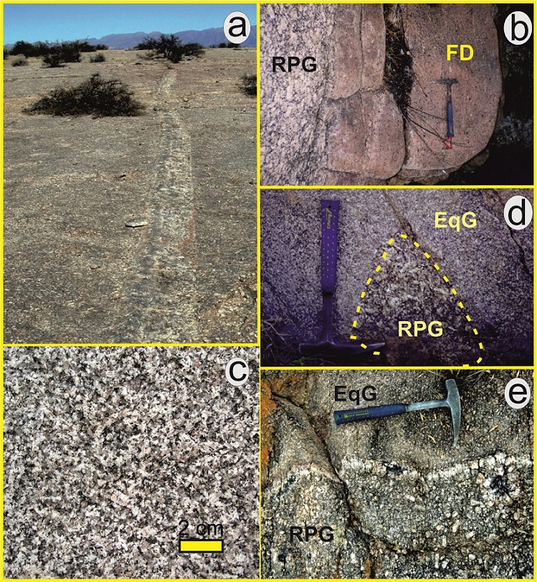Equigranular Granites (EqG): the EqG (Fig. 5c) are small bodies or stocks that intrude the RPG (Fig. 5d). Their sizes vary from very small (<100 m diameter) to larger stocks of more than 1 km2. They have irregular shapes and usually sharp contacts (Fig. 5e).