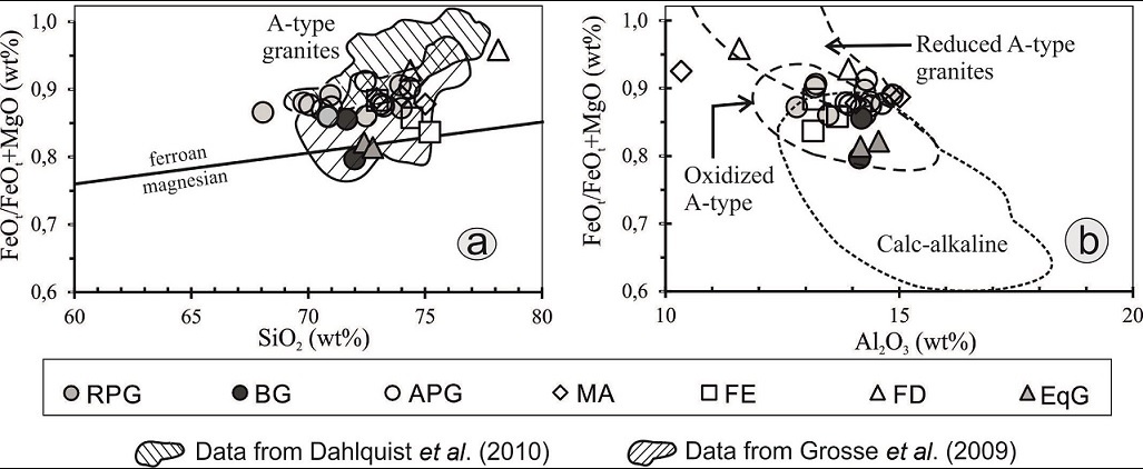 All samples are rich in FeOt in relation to MgO, with FeOt/FeOt+MgO ratios >0.79 (wt%) (Fig. 6a). Most samples plot in the ferroan field of “A-type granites” in the diagram of Frost et al. (2001) (Fig. 6a) in agreement with Grosse et al. (2009) and Dahlquist et al. (2010). In the diagram of Dall' Agnol and Oliveira (2007) (Fig. 6b) the samples plot in both the “reduced” and “oxidized” A-type granite fields.
