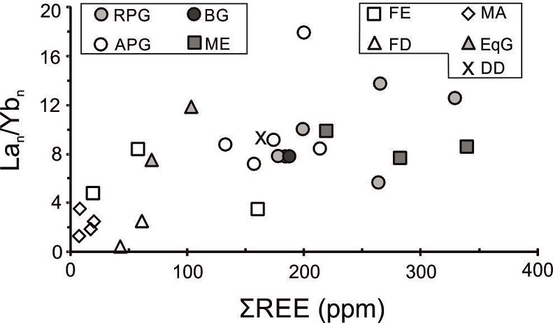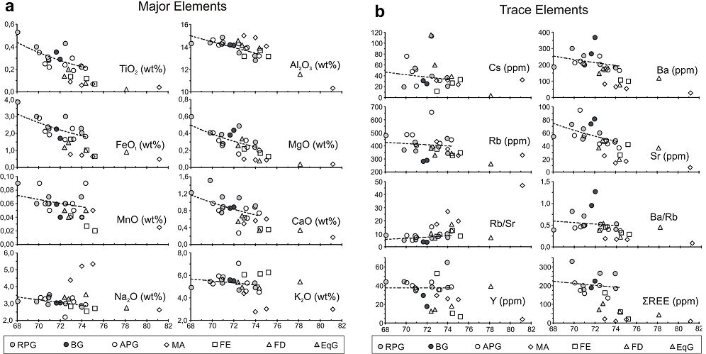 Regarding trace element contents, the rocks show both differences and similarities. In the case of Cs, the lowest values are in samples of the FD and FE (~4 and ~12 ppm, respectively), and the highest ones in samples of the EqG and APG (~115 ppm). Lower Rb contents (<300 ppm) are recorded in the BG facies and in one sample of the FD, while the highest content corresponds to a sample of the APG (658 ppm). Roughly, Ba and Sr contents gradually increase in the following sequence: MA, FD, FE, EqG, APG, RGP, BG. The BG facies contains the lowest Rb/Sr (3.6 and 3.8) and highest Ba/Rb (0.95 and 1.27) ratios, whereas the MA contains the highest (17.4-47.0) and lowest (0.09-0.19) ratios, respectively.
