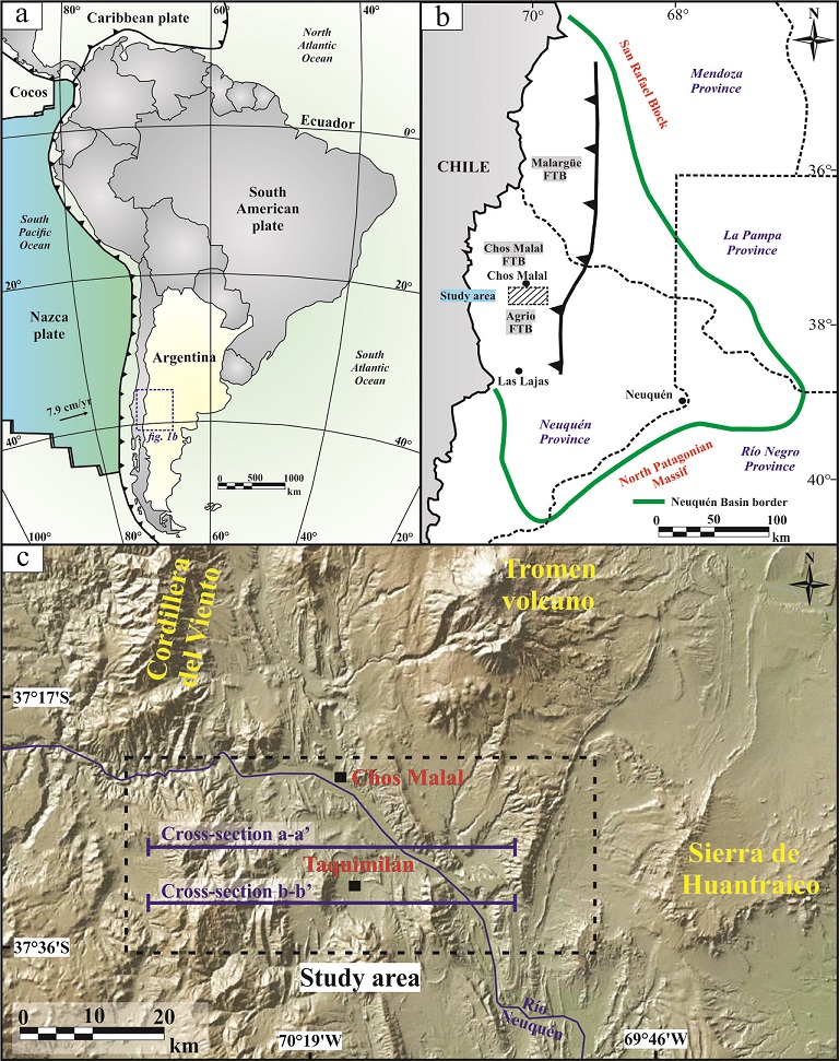 Fig. 1. a. Present-day tectonic setting at the convergent border between the Nazca and South American plates; b. Limits of the Mesozoic Neuquén Basin with the location of the Agrio, Chos Malal and Malargüe fold and thrust belts (FTB); c. Digital elevation model of the study area in the northwest of the Neuquén Province.