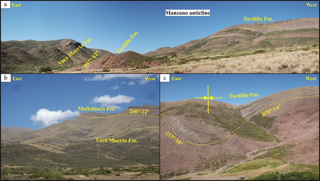 The oldest rocks exposed in this region correspond to the Late Jurassic Tordillo Formation, which are folded forming the El Cholar and Manzano anticlines (Fig. 3). These folds have wavelengths between 7 and 9 km and they locate south of the Rahueco anticline, thus basement rocks should be involved at depth. Both anticlines have east vergence, in which their eastern limbs dips 50°-60° E (Fig. 10a), and their western limbs dip of 15°-30° W (Fig. 10b). The El Cholar anticline is interpreted as a thick-skinned fault-propagation fold, with relatively minor displacement, and the Manzano anticline as a basement-involved fault-bend fold whose eastward movement produce thin-skinned deformation in the adjacent cover rocks (Fig. 9). Minor-scale folding affects the Tordillo Formation in the proximities of Tres Chorros (Figs. 3 and 10c), which can be considered thin-skinned structures probably detached from the underlying evaporites of the Auquilco Formation.
