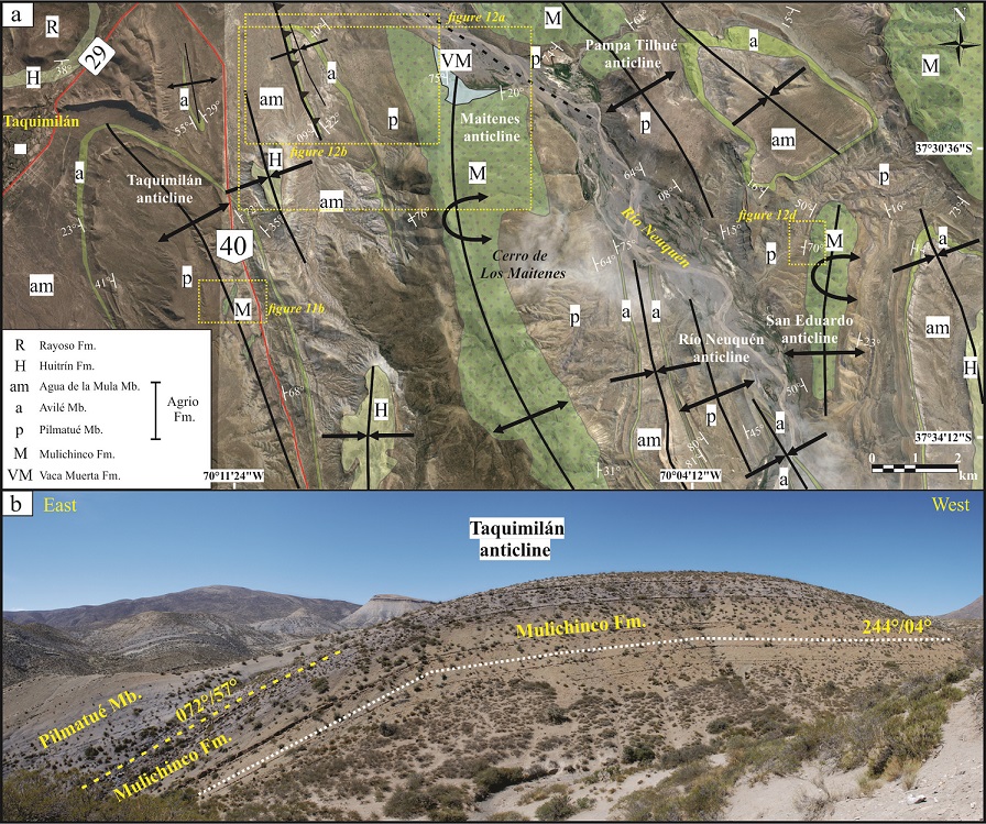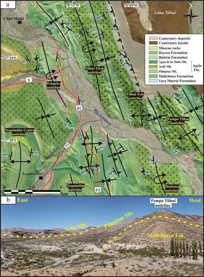 Fig. 8. a. Detailed geological map showing the structures in the Loma Tilhué area. b. Photograph of the forelimb of the Pampa Tilhué anticline and the frontal syncline cored by the Avilé Member (see location in figure 3).