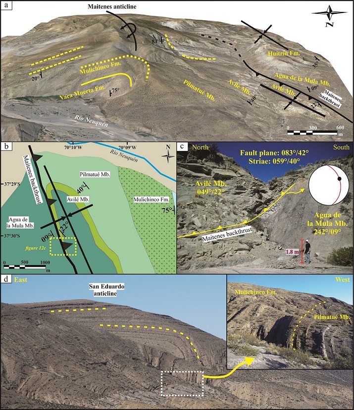 Fig. 12. a. Schematic interpretation of the Maitenes anticline over a 3D Google Earth image; b. Detailed map of third-order structures affecting the Agrio Formation to the west of the Cerro de Los Maitenes; c. Photography of the Maitenes backthrust showing the measurements on the fault plane; d. Photos of the forelimb of the west-vergent San Eduardo anticline.