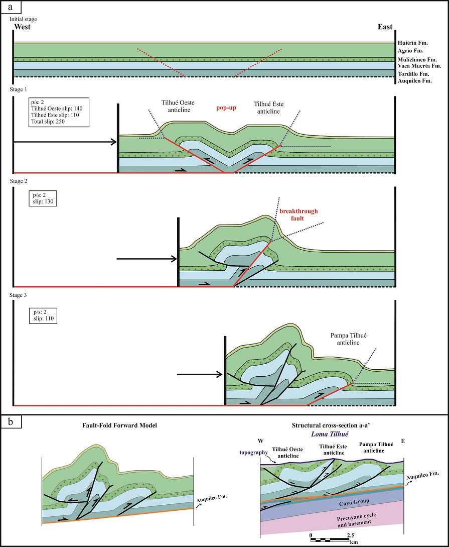 Fig. 13. a. Forward modelling constructed with the Fault Fold Forward software (Allmendinger, 2012) for explaining the sequential evolution of the complex structures at the Loma Tilhué, in cross-section a-a’. Initial Stage: Configuration of the Mesozoic units prior to the deformation; Stage 1: Development of two opposite-vergence fault-propagation anticlines creating a pop-up structure; Stage 2: Continued contraction forms an out of sequence breakthrough fault that cuts the Tilhué Este anticline; Stage 3: Formation in sequence of the Pampa Tilhué anticline, folding the previous structures to their final configuration; b. Comparison between the fault-fold forward model and the natural structures along this sector of the structural cross-section a-a’.