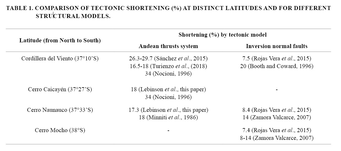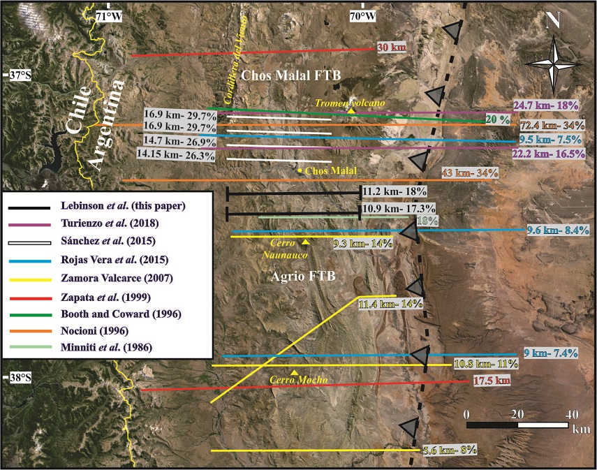 Interpretation of poor-quality seismic lines in the study area does not show clear evidence of a significant inversion processes. Comparable conclusions arise from subsurface interpretations (Sánchez et al., 2015; Turienzo et al., 2018) and field observations (Sagripanti et al., 2014) in the Chos Malal FTB, where the Late Triassic-Early Jurassic normal faults were only partially inverted and they preserve their extensional character. Many regional cross-sections have been made along the Agrio and Chos Malal fold and thrust belts in the last three decades, analysing the structural style of the deformed regions of the Neuquén Basin (Fig. 14). Most of the interpretations coincide in that the tectonic shortenings in the Andes of Neuquén decrease toward the south, from the Cordillera del Viento (~37° S) to the Cerro Mocho (~38° S). In addition, the calculated magnitudes of contraction are smaller in cross-sections considering the reactivation of normal faults as the main mechanism for the fold and thrust belt construction (Table 1).