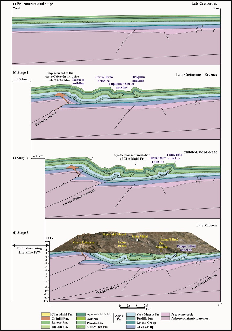 Cobbold and Rossello (2003) observed in outcrops and in seismic lines an angular unconformity between the Huitrín and Rayoso formations, approximately 25 km to the southeast of the study area. Thus, they proposed the beginning of Andean compression during the upper Early Cretaceous (Aptian-Albian). Other studies consider that the red beds of the Neuquén Group, which lie unconformably over the Rayoso Formation, are synorogenic deposits accumulated in a foreland basin related to Late Cretaceous deformation (Ramos, 1981; Ramos and Folguera, 2005; Zamora Valcarce et al., 2009; Tunik et al., 2010). In addition, Cobbold and Rossello (2003) argued that folding was active from the Late Cretaceous and continued until the Eocene based on the angular unconformity between Cayanta Formation (39±9.1 Ma 40K/40Ar, Llambías and Rapela, 1989) and the Bajada del Agrio Group in the Colipilli region. Through the study of apatite fission tracks, Rojas Vera et al. (2015) proposed that the Cretaceous deformation extends to the Paleocene, and perhaps until the Eocene. Our kinematic model, based on the cross-section a-a’, indicates that the initial deformation occurred during the Late Cretaceous-Eocene stage with the formation of the Rahueco basement-involved wedge (Fig. 15 stage 1). As this first-order structure moves eastward along the evaporites of the Auquilco Formation it generates the Cerro Pitrén anticline (second-order structure), which in turn transmits deformation to shallower levels forming third-order structures as the Taquimilán Centro and Truquico anticlines. A deformation model that links thick-skinned structures with thin-skinned fault-related folds of different order was proposed and documented in the Chos Malal FTB (Kozlowski et al., 1998; Sánchez et al., 2014, 2015; Turienzo et al., 2014, 2018). The Eocene igneous rocks that form the Cerro Caicayén intrude Jurassic strata using the backthrusts in the forelimb of the Rahueco anticline as feed channels, suggesting that the deformation of the area predated intrusion or were contemporaneous (Lebinson et al., 2015b).