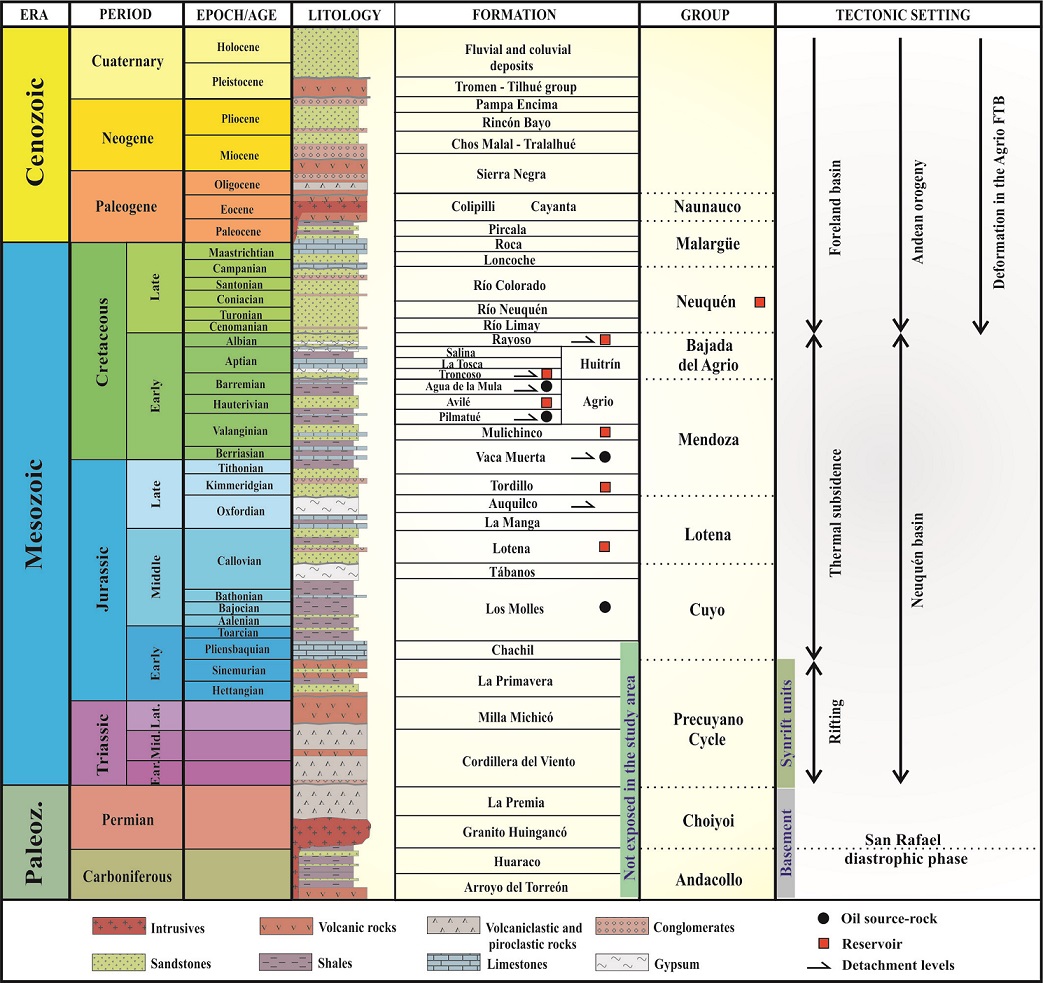 This work was financed by CONICET PIP 0583, CONICET P-UE47CO, FONCYT PICT 2015-0419 y SECYTUNS PGI 24/h136. We are grateful to the Departmento de Geología of the Universidad Nacional del Sur and INGEOSUR-CONICET for logistical and financial support. We also acknowledge the Subsecretaría de Energía, Minería e Hidrocarburos of the Neuquén Province for providing the seismic lines and well information, and the Municipalidad of Chos Malal for supporting the field work. We greatly appreciate the comments and suggestions by reviewer J. Skármeta and Editor W. Vivallo, which considerably improved this paper.