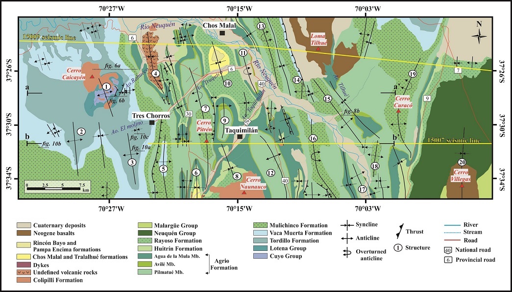 Fig. 3. Geological map of the northern segment of the Agrio FTB. 1. Rahueco anticline; 2. El Cholar anticline; 3. Manzano anticline; 4. Rahueco synclinorium; 5. Tres Chorros anticline; 6. Tralalhué syncline; 7. Cerro Pitrén anticline; 8. Naunauco syncline; 9. Taquimilán Centro anticline; 10. Truquico syncline; 11. Truquico anticline; 12. Taquimilán anticline; 13. Tilhué Oeste anticline; 14. Tilhué Este anticline; 15. Pampa Tilhué anticline; 16. Maitenes anticline; 17. Río Neuquén anticline; 18. San Eduardo anticline; 19. Las Yeseras anticline; 20. Cerro Villegas syncline.