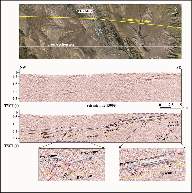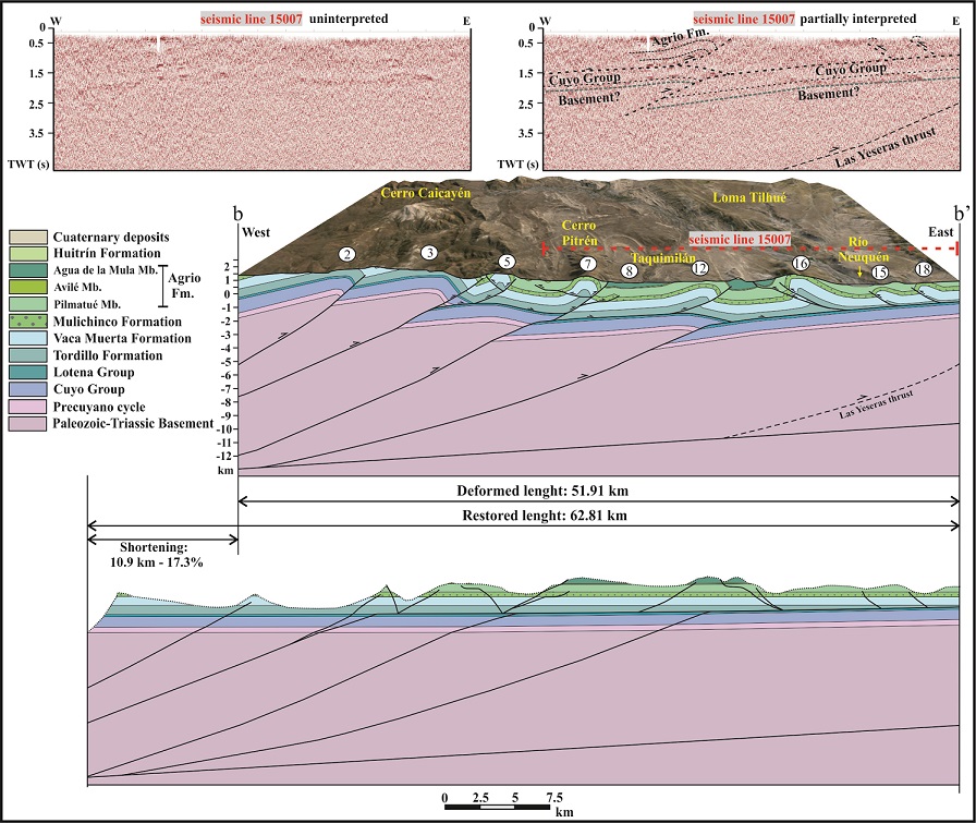 The reconstruction of the tectonic structures in depth along the north cross-section was analysed in conjunction with the information provided by seismic line 15009 (Fig. 4). Despite it ´s poor quality, this line shows west-dipping reflectors that allows the interpretation of the basement-cover contact geometry. The elevation of the basement-cover contact at the eastern sector of the seismic section is linked to the west-dipping Las Yeseras thrust (Fig. 4), responsible of a notable basement-cored anticline exposed outside the studied area. Although there are no exploration wells along this seismic line, these strong and continuous reflectors can be assigned to the Jurassic sedimentary sequences. Below them, diffuse reflectors with varying thicknesses suggest the occurrence of synrift deposits of the Precuyano Cycle (Fig. 4). These synrift sequences have been related with high angle normal faults, which have been slightly inverted during the subsequent compressive deformation in the Andes. Bed-length restoration of cross-section a-a’ (Fig. 5) allows to establish 11.2 km (18%) of shortening.