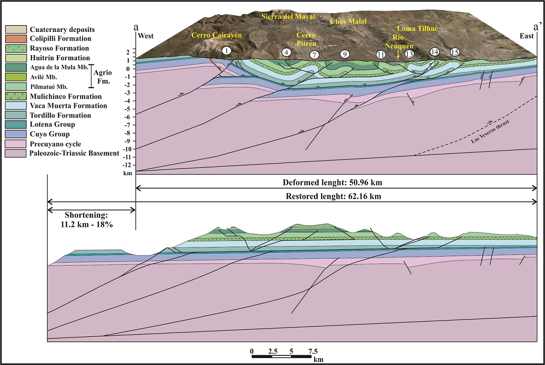Fig. 5. Interpreted and restored structural cross-section a-a’. Major basement-involved thrusts produce first order thick-skinned wedges, which move eastward over the Auquilco Formation (Lotena Group) creating second and third order fault-related folds in the sedimentary cover. 1. Rahueco anticline; 4. Rahueco synclinorium; 7. Cerro Pitrén anticline; 9. Taquimilán Centro anticline; 11. Truquico anticline; 13. Tilhué Oeste anticline; 14. Tilhué Este anticline; 15. Pampa Tilhué anticline.