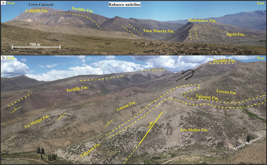 In our study region, an example of complex thin-skinned deformation occurs at the Loma Tilhué, where three second-order anticlines are exposed in a relatively small area (Figs. 3 and 8a). The observed structural configuration results from the combination of fault propagation folds with variable vergence that involve the entire Mendoza Group (Fig. 5).