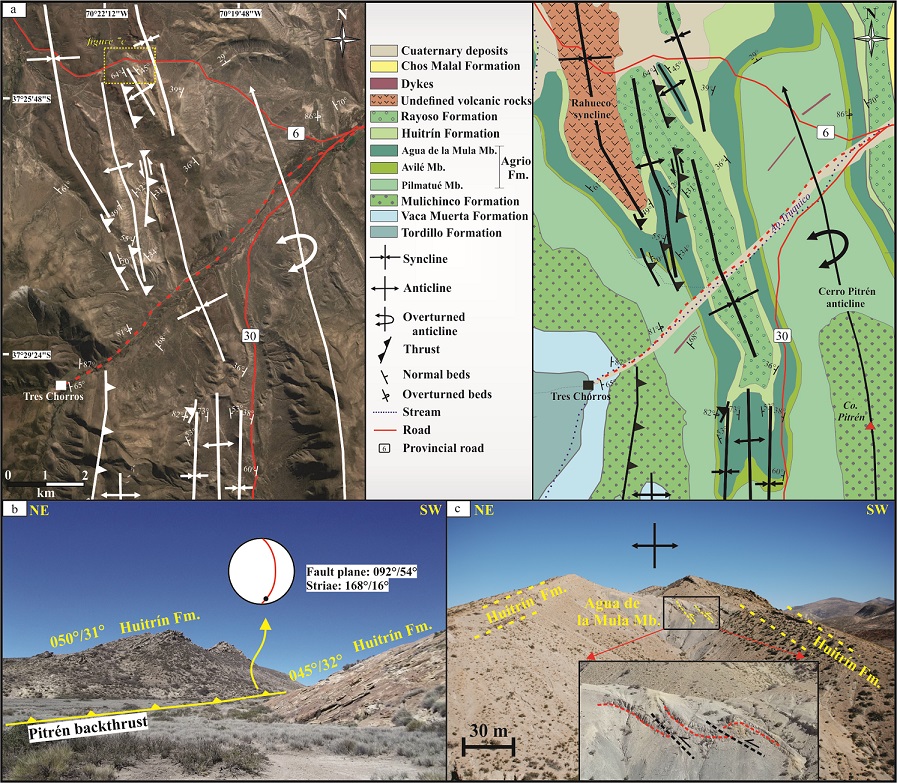 Fig. 7. a. Google Earth image and detailed geological map between Tres Chorros and Cerro Pitrén; b. Photograph of the Pitrén backthrust, a transpressive fault that duplicates the Huitrín Formation; c. Southward view of a third-order anticline, containing minor faults in the core interpreted as into-anticline thrusts.