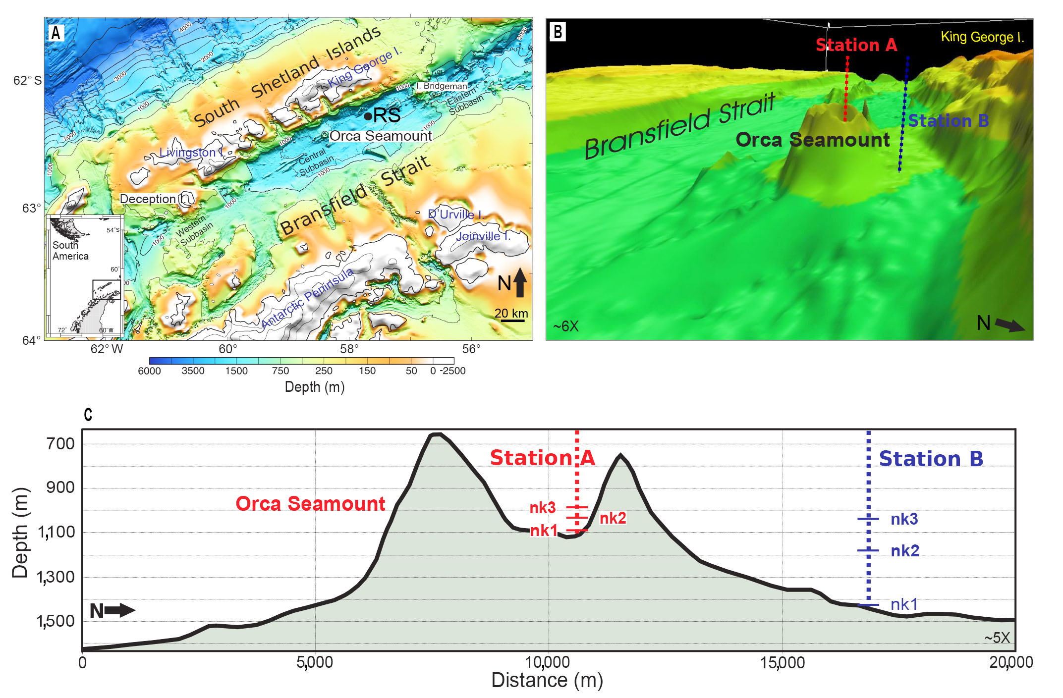 Fig. 2. Topography model of the studied area using multibeam bathymetry data available from Marine Geoscience Data System (hosted by LDEO-Columbia University). A. Location of the Orca Seamount in the Bransfield Strait and the “Reference Station” for δ3He data (RS); B. 3D submarine topography model of Orca seamount and the location of Stations A (red line) and B (blue line); C. Bathymetric profile that cross stations A and B, showing depth levels of Niskin bottle sampling.