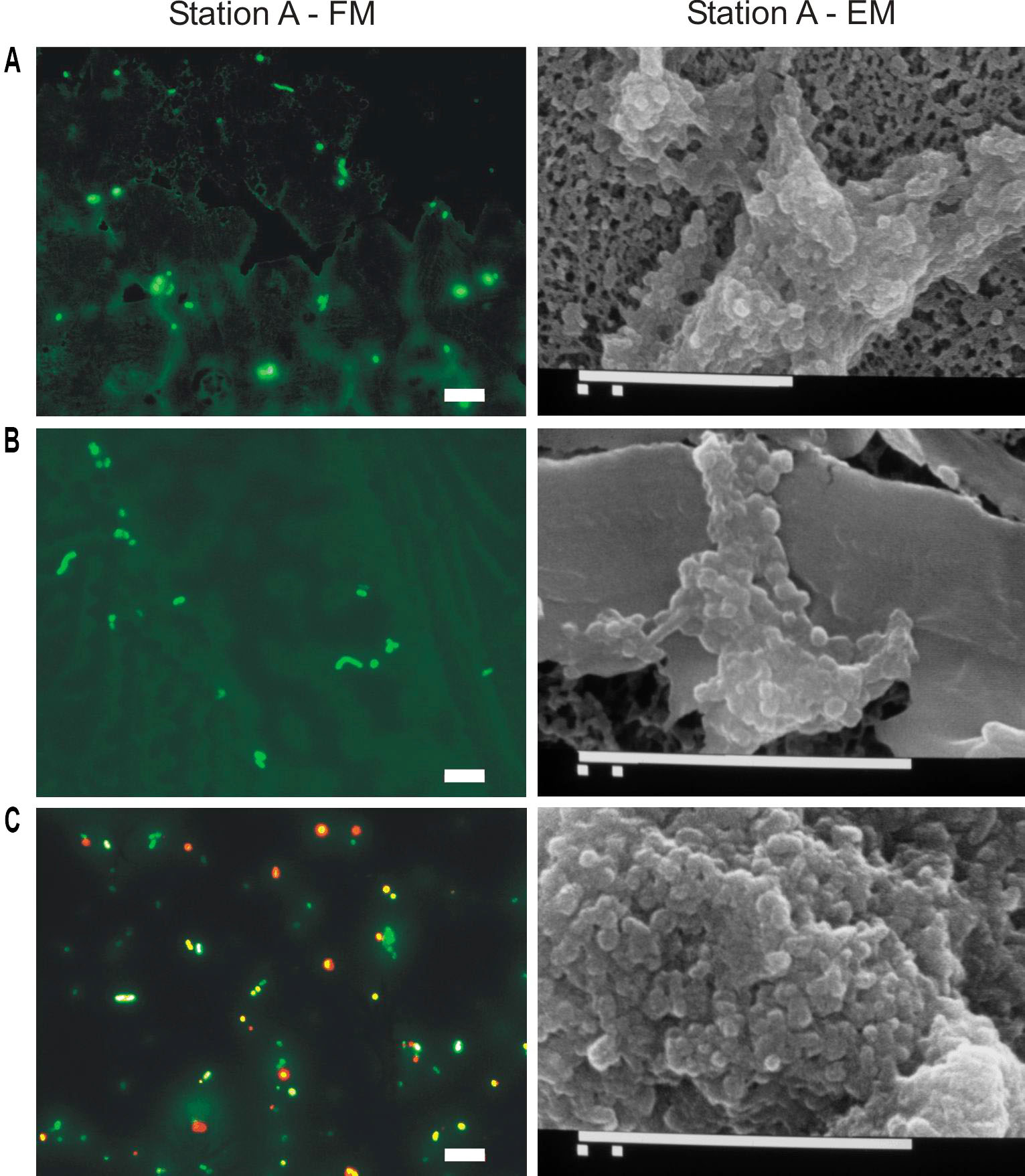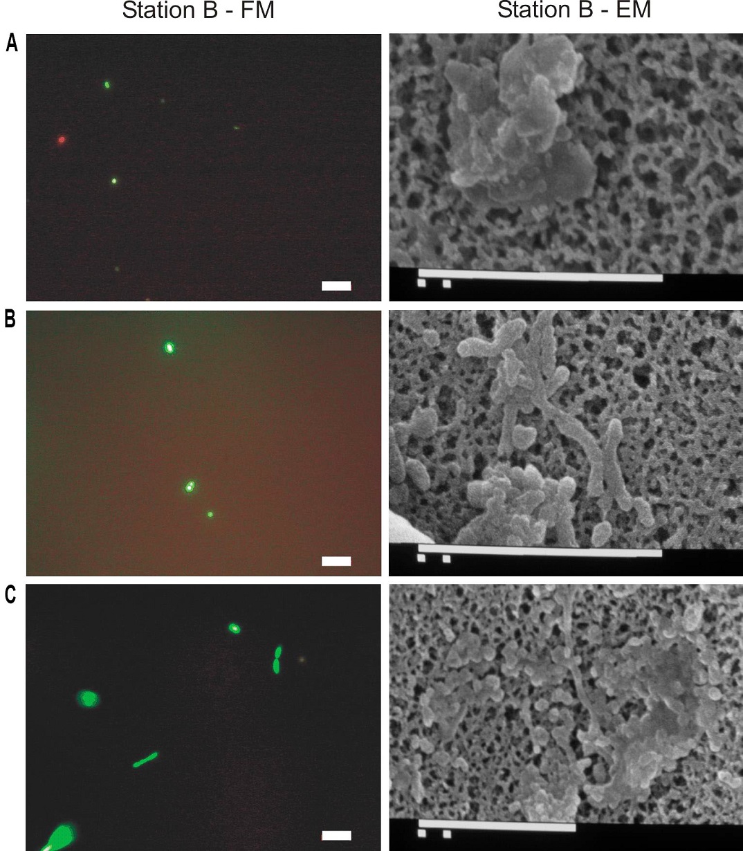 Fig. 5. Fluorescent (left side) and electronic microscopy (right side) of thermophilic and hyperthermophilic microorganisms for bottle samples of Station B. Scale bars indicate 10 μm. A. nk 3: at 1,036 m depth; B. nk 2: at 1,186 m depth; C. nk 1: at 1,036 m depth.