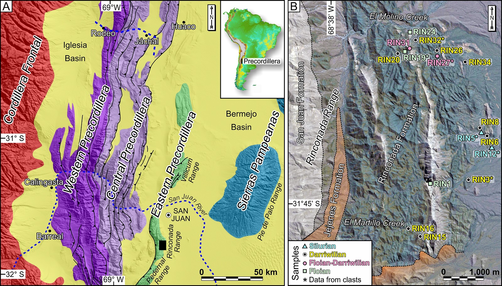 The age of the Rinconada Formation is difficult to establish due to the inherent reworked nature of the mélange and the scarcity of its fossil content. Regionally, it overlies through an erosional hiatus the passive-margin limestones of the San Juan Formation (Lower to Middle Ordovician). The lacuna is narrower in the Villicum and Pedernal sections where the mélange rests over late Middle-Late Ordovician siliciclastic foreland deposits (Gualcamayo, La Pola and La Cantera formations), or the glacial-related Hirnantian-Llandovery Don Braulio Formation (Peralta, 1993; Astini, 2001; Mestre and Heredia, 2014). Considering that the base of the formation is synchronous, a maximum age is given by the latter stratigraphic unit, which contains Rhuddanian fossils (Volkheimer et al., 1980; Peralta, 1986).