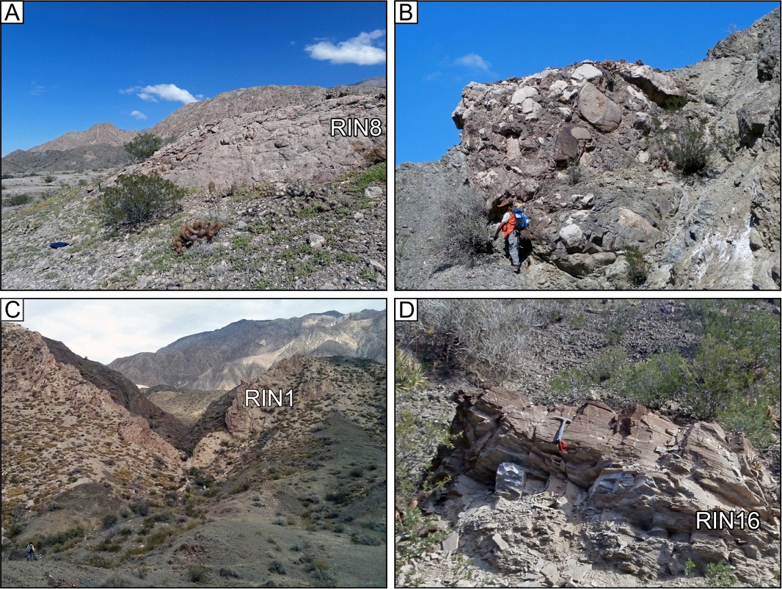FIG. 2. Outcrops of the Rinconada mélange in the study area, with examples of the sampled lithologies. A. Limestone block (sample RIN8); B. Conglomerate block containing rounded clasts of limestones, sandstones and of crystalline rocks; C. km-scale limestone slab of the San Juan Formation (sample RIN1) enclosed in a greenish fine-grained sandy matrix; D. dm-scale block of graptolitic quartz-arenite with calcareous cement (sample RIN16).