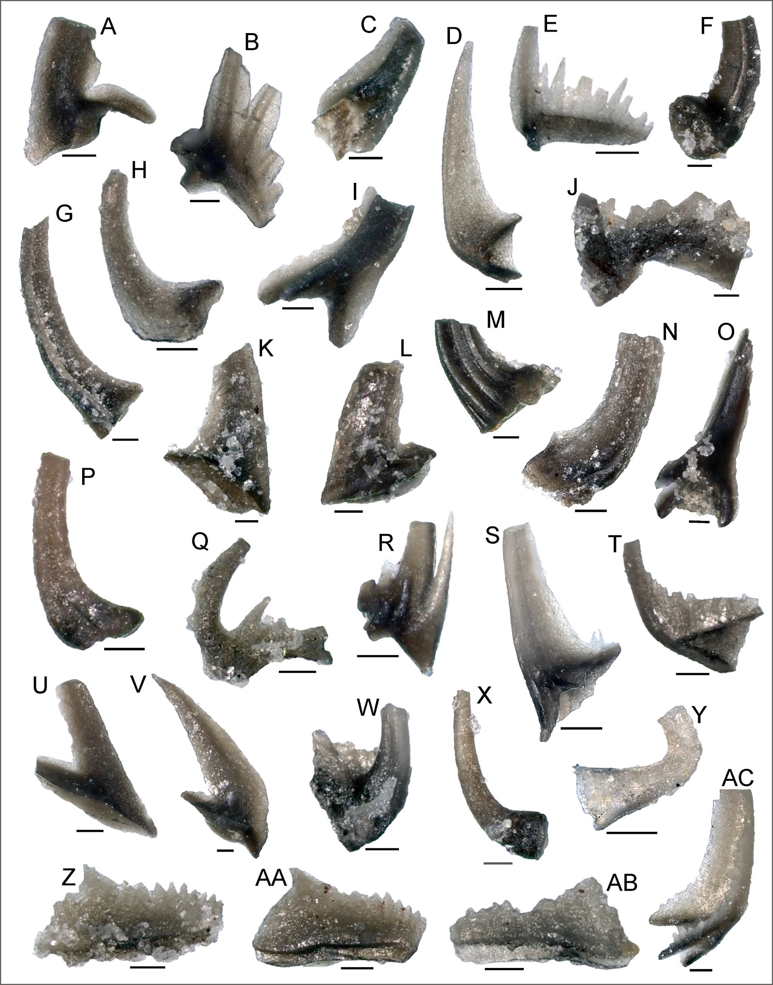 FIG. 3. Selected conodonts from the Rinconada Formation Scale bar 0,1 mm. A. Tropodus sweeti (Serpagli), M element, RIN1, CORD-MP 56001; B. Bergstroemognathus extensus (Graves and Ellison), M element, RIN1, CORD-MP 56002; C. Juanognathus variabilis Serpagli, Sa element, RIN1, CORD-MP 56003; D. Reutterodus andinus Serpagli, M element, RIN1, CORD-MP 56004; E. Oepikodus evae (Lindström), P element, RIN1, CORD-MP 56005; F. Scolopodus striatus Pander, P? element, RIN3, CORD-MP 56006; G. Juanognathus variabilis Serpagli, Sa element, RIN1, CORD-MP 56007; H. Paroistodus originalis (Sergeeva), Sb element, RIN1, CORD-MP 56008; I. Tropodus sweeti (Serpagli), Sb element, RIN1, CORD-MP 56009; J. Periodon macrodentatus (Graves and Ellison), Sb element, RIN3, CORD-MP 56010; K.Rossodus barnesi Albanesi, Sb element, RIN6, CORD-MP 56011; L. Drepanoistodus bellburnensis Stouge, M element, RIN6, CORD-MP 56012; M. Costiconus costatus (Dzik), S element, RIN3, CORD-MP 56013; N. Protopanderodus gradatus Serpagli, S element, RIN24, CORD-MP 56014; O. Pteracontiodus cryptodens (Mound), Sa element, RIN3, CORD-MP 56015; P. Parapanderodus paracornuformis (Ethington and Clark), S element, RIN15, CORD-MP 56016; Q.Paroistodus h. horridus (Barnes and Poplawski), S element, RIN15, CORD-MP 56017; R. Erraticodon sp., Pb? element, RIN15, CORD-MP 56018; S.Gothodus sp., Pa element, RIN19, CORD-MP 56019; T. Ansella jemtlandica (Löfgren), Sa element, RIN8, CORD-MP 56020; U. Paltodus deltifer deltifer (Lindström), M element, RIN19, CORD-MP 56021; V. Rossodus barnesi Albanesi, M element, RIN15, CORD-MP 56022; W. Periodon macrodentatus (Graves and Ellison), Sb element, RIN20, CORD-MP 56023; X. Semiacontiodus potrerillensis Albanesi, S element, RIN6, CORD-MP 56024; Y. Cornuodus longibasis (Lindström), Sa element, RIN24, CORD-MP 56025; Z. Histiodella serrata Harris, Pa, RIN15, CORD-MP 56026; AA. Histiodella sinuosa Graves and Ellison, Pa element, RIN15, CORD-MP 56027; AB. Histiodella minutiserrata Mound, Pa element, RIN20, CORD-MP 56028; AC. Tropodus sweeti (Serpagli), P element, RIN19, CORD-MP 56029.