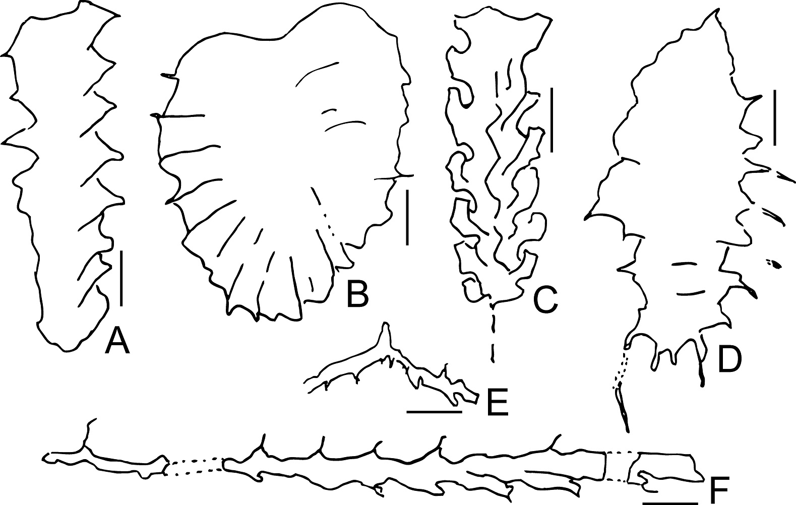 FIG. 4. Sampled graptolites from the Rinconada Formation Scale bar 0,1 mm. A. Cryptograptus schaeferi (Lapworth), CORD-MP 25805; B. Bergstroemograptus crawfordi (Harris), CORD-MP 25895A; C. Archiclimacograptus sp., CORD-MP 25895A; D. Glossograptus sp., CORD-MP 25885; E. Holmograptus spinosus (Ruedemann), CORD-MP 25827; F. Holmograptus spinosus (Ruedemann), CORD-MP 25827.