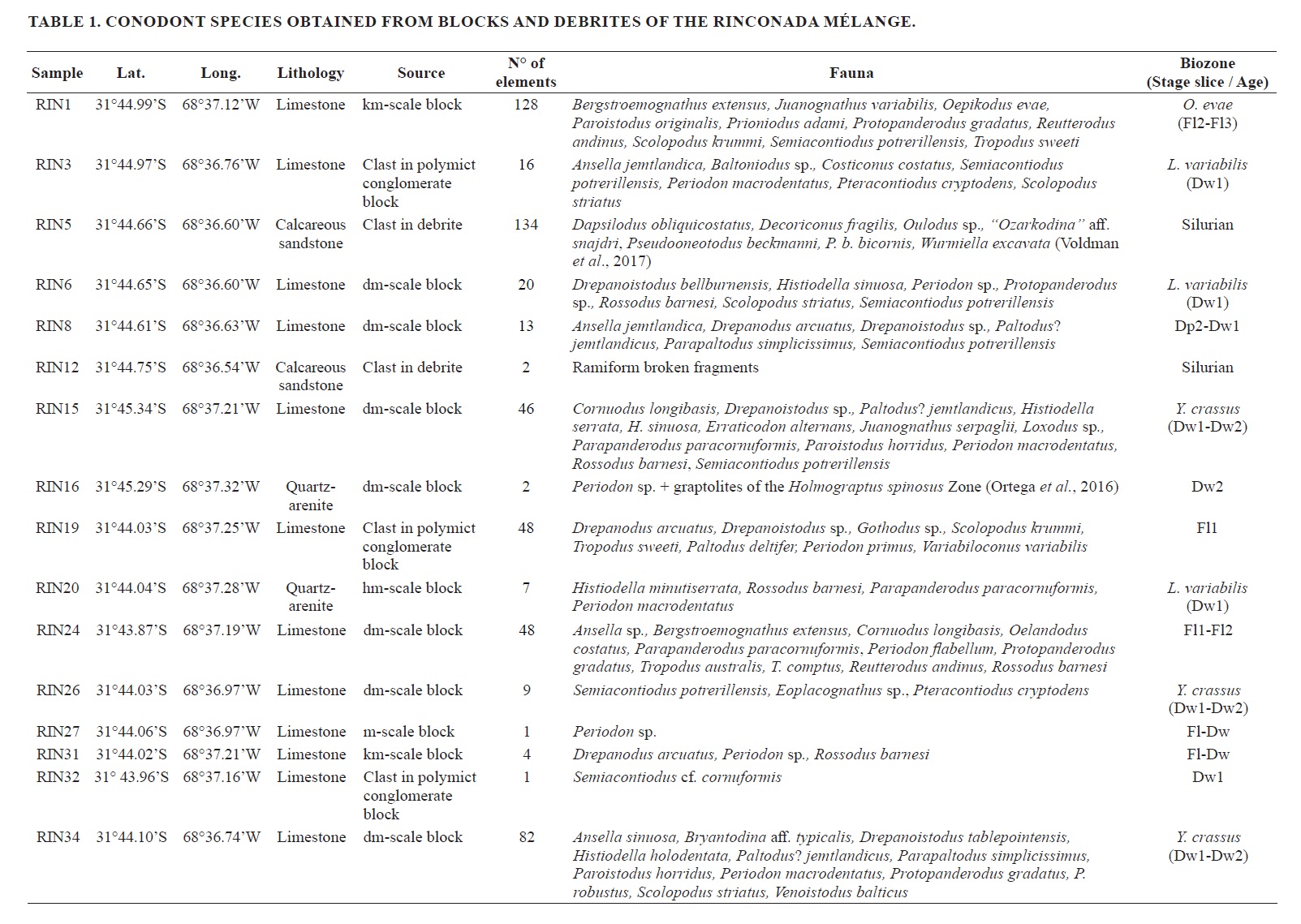 The Ordovician conodont fauna obtained from reworked blocks and clasts of the Rinconada Formation include typical assemblages from the platform (e.g., Semiacontiodus and Cornuodus) and slope (e.g., Periodon and Paroistodus) settings of the Precordillera. The fauna consists of endemic and cosmopolitan species of Laurentian and Baltic affinity, representing the major Midcontinent and Atlantic Realms (e.g., Albanesi and Bergström, 2010). The record of Gothodus sp. (Fig. 3S) in limestone clasts may suggest a link with the perigondwanan cold-water assemblages of the Central Andean Basin, as similar priniodontiforms with poorly developed denticulation have been recognized in the Floian Acoite Formation (Voldman et al., 2017b). The presence of Erraticodon patu in the Precordillera, the Famatinian Range and the Central Andean Basin supports this palaeobiogeographic link as well (Albanesi and Bergström, 2010; Heredia et al., 2013).
