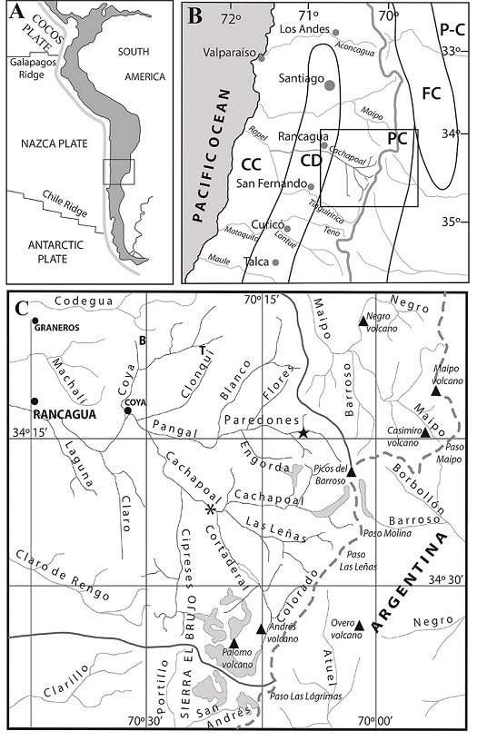 Fig. 1. A. Location of the study region in the Central Andes; square indicates location of figure 1B. B. Morphostructural subdivision of the Andean Principal Cordillera in central Chile and Argentina; square indicates location of figure 1C. Thick gray line indicates the international boundary between Chile and Argentina. CC: Coastal Cordillera; CD: Central Depression; PC: Principal Cordillera; FC: Frontal Cordillera; P-C: Precordillera. C. Fluvial systems in the western Principal Cordillera, between approximately 34° to 34°45’S. The Cachapoal catchment before its junction with the Tinguiririca River east of the Coastal Cordillera covers a surface of 6,370 km2 (Niemeyer Fernández, 1980) and of 1,902,2 km2 in the Principal Cordillera (Caviedes, 1979). Major glaciers are represented in light gray and the volcanoes with black triangles. Solid gray lines separate the Cachapoal from the Maipo and Tinguiririca catchments; B: Barahona region; T: Location of the El Teniente copper mine; Black star: Location of the Paredones Lavas mentioned in text; Asterix: Approximate location of meteorologic station, where the referred pluviometric data for the Cachapoal catchment stem.