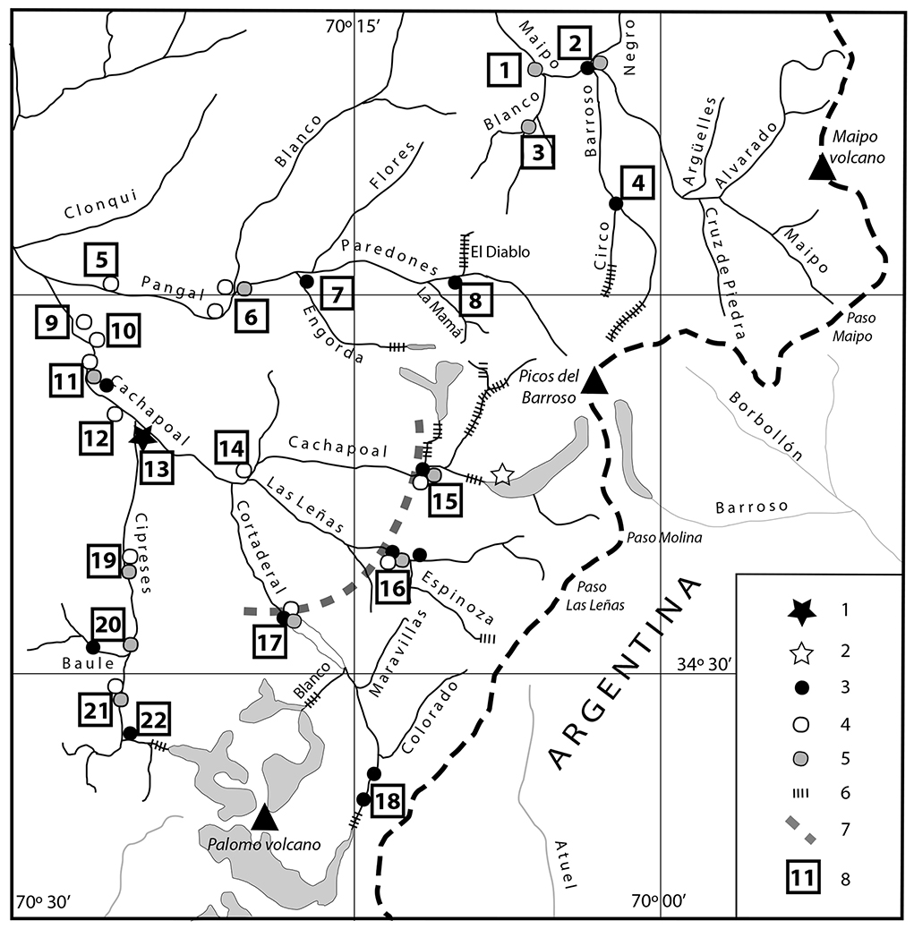 Little can be said about the southern Maipo drainage basin considered in this study apart from the existence of one major moraine in the junction of the Negro, Maipo and Barroso river valleys (site [2] in Fig. 8). Its altitude (2,200 m) is similar to the altitude of the three moraines in the Cachapoal catchment (sites [15], [16] and [17]) that we tentatively correlated with each other; therefore, we consider the possibility that the Maipo moraine could be also included in this correlation.