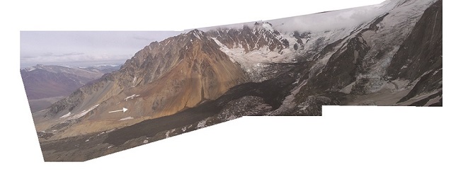 Fig. 2. Panoramic westward air view (March, 2007) of the foot of the southern cliff of the Picos del Barroso Massif showing a quartz diorite outcrop (white arrow) at the bottom of the orange colored slope. The Cachapoal Glacier is covered by an avalanche of black Jurassic shale underlying the lavas forming the upper part of the unstable and steep southern flank of the Picos del Barroso Massif. According to historical images provided by Google Earth similar avalanches occur rather often. In the background, red outcrops of the Late Jurassic continental Río Damas Formation (Fig. 3).