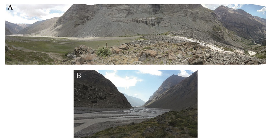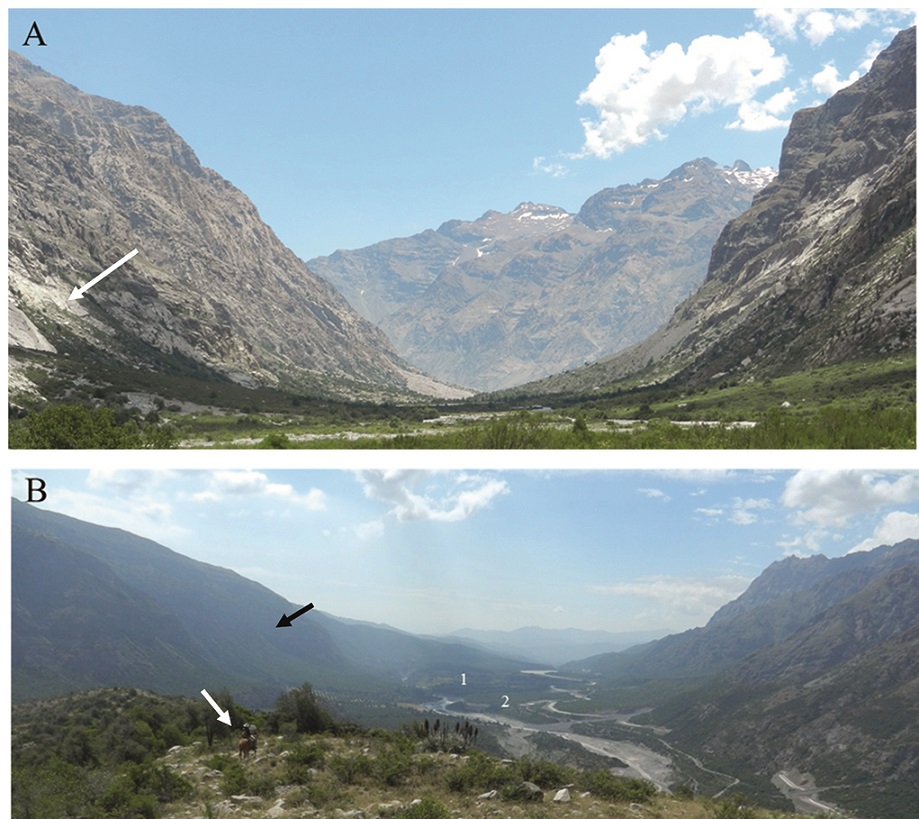 One of the best preserved U-shaped valleys is the Paredones valley, which is the eastern prolongation of the Pangal Valley east of its junction with the Blanco River. The U-shape is well developed down-stream up to the Pangal Landslide somewhat below the Pangal- Paredones and Blanco rivers junction (Antinao and Gosse, 2009) (6 in Fig. 8). A well-developed U-shaped Cachapoal valley, as well as those of the upstream tributaries, the Las Leñas, Cortaderal and Cipreses, can be observed down to the rather low region of the Bocatoma Chacayes landslide (Fig. 9A, B). In both catchments, the Paredones and the lower Cachapoal, the U-shape disappears or is less evident where the river begins to cut the Abanico Formation after having crossed the Farellones Formation swath.