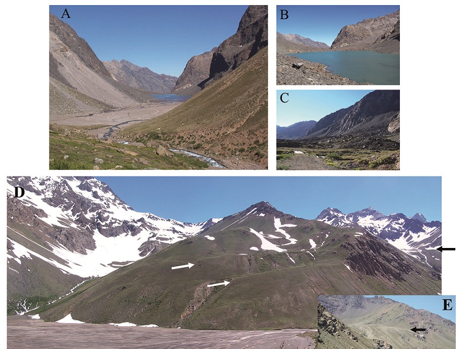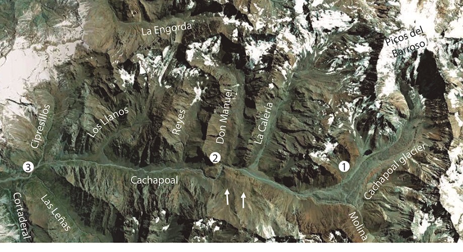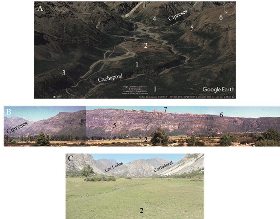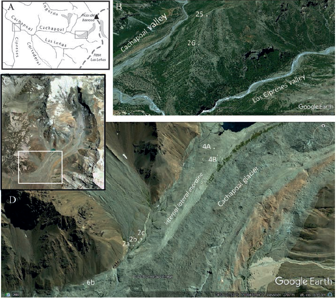 The glacial deposits along the Cachapoal valley are the result of glacial advance and retreat since middle Pleistocene time. Glaciers in this drainage system that includes the Cachapoal, Pangal-Paredones, Las Leñas, Cortaderal and Cipreses valleys, reached lengths of up to 60 km descending to, at least, Bocatoma Chacayes, at an altitude of 950 m a.s.l. (Fig. 1C).