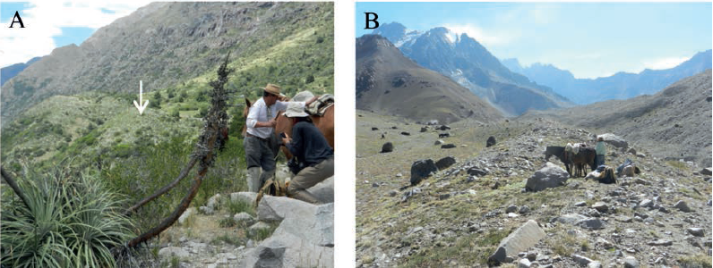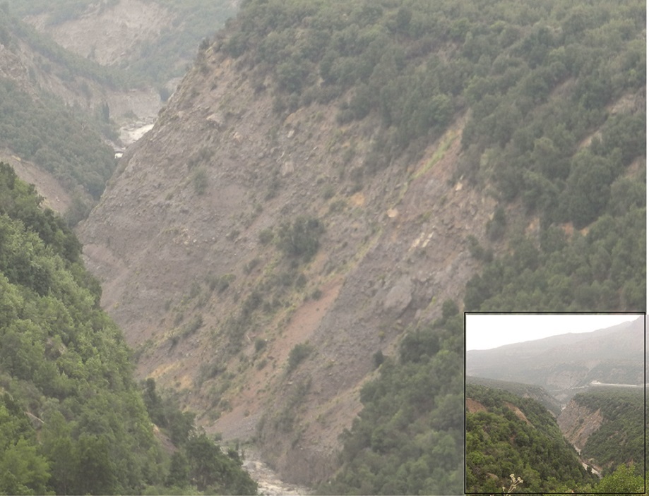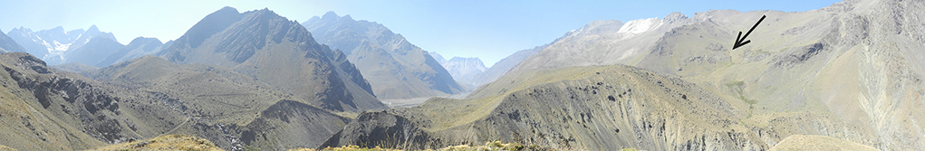The abundance of debris material fallen from the southern slope of the valley can be explained by the pervasive fracturing of the rocks due to the existenc of two faults, the Espinoza and El Diablo (Charrier et al., 2002), that intersect close to each other the ridge that separates the Cachapoal and the Las Leñas river valleys (Fig. 3C) at the locations indicated by the arrows in figure 13.