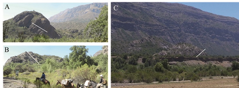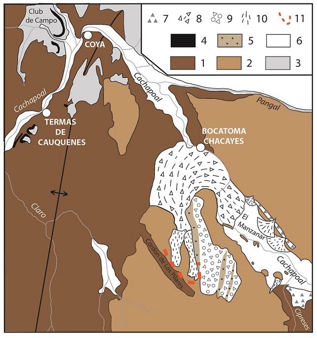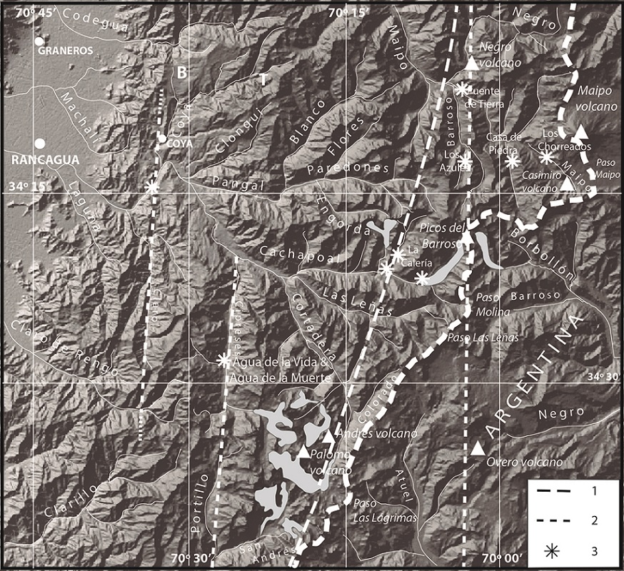 Based on the straight course of streams, and presence of thermal springs, two north-south oriented lineaments can be traced on the western part of the study region. The westernmost one is defined by the volcanic region in the Barahona area, north of Coya (Figs. 1 and 6), from where the Colón-Coya Avalanche originated, the Termas de Cauquenes thermal source and the north-south trending Claro valley. This lineament coincides with the southward prolongation of the San Ramón Fault that runs along the western border of the Principal Cordillera, east of Santiago (Vargas et al., 2014). The next one to the east is defined by the Cipreses and Portillo river valleys with the sources Agua de la Vida and Agua de la Muerte, in the Cipreses valley. The northward prolongation of this lineament roughly coincides with the location of the El Teniente ore deposit (Fig. 6). A third lineament is defined by the straight north- south alignment of the Negro volcano, the Picos del Barroso volcanic massif and the Overo volcano (Fig. 6). Further south in Argentina, along this same alignment, other volcanoes are known, like the Sosneado and Risco Plateado. Two thermal sources are known in Chile along this lineament: Puente de Tierra, near the junction of the Maipo and Negro rivers, and the splendid development of travertine ponds at Los Azules, in the Estero El Circo, a tributary of the Barroso river, in the Maipo catchment.