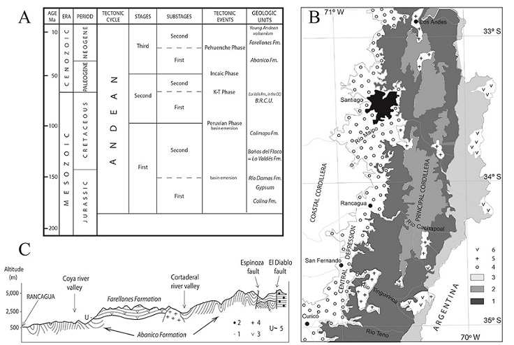 Fig. 3. A. Andean stages, tectonic events and geological units in the Principal Cordillera in the central Chilean Andes. B. Distribution of the Mesozoic and Cenozoic Abanico and Farellones formations in the Principal Cordillera. 1. Abanico Formation; 2. Farellones Formation; 3. Mesozoic units in the eastern Principal Cordillera in Chile; 4. Quaternary deposits in the Central Depression; 5. Plutonic bodies; 6. Volcanic deposits of the present-day magmatic arc or Young Andean Volcanism. C. Generalized east-west geological cross section of the Principal Cordillera at approximately 34º15’S along the Cachapoal river drainage. 1. Callovian and Early Cretaceous marine deposits; 2. Río Damas Formation; 3. Farellones Formation; 4. Miocene plutons; 5. Unconformity.