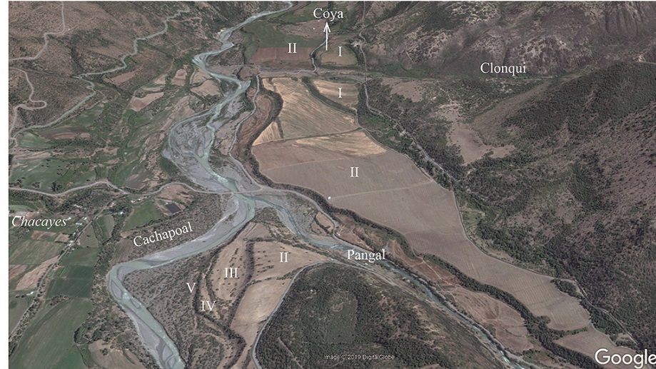 The oldest moraine deposits recognized in the Cachapoal catchment are the lateral ridges at Los Cerrillos. Although these ridges are exposed at a higher altitude than the lateral moraine mapped by Santana (1967) on the opposite or right river side they are exposed somewhat upstream and can perfectly be correlative to the right side moraine ridge. In fact, the downstream inclination of the ridges at Los Cerrillos if prolonged downstream would intersect the Cachapoal thalweg approximately at Bocatoma Chacayes, similarly as do the moraine ridge on the opposite right river side. Hence, the major Cachapoal glacier advance would have reached Bocatoma Chacayes and, according to the age obtained for the moraine ridge at Los Cerrillos, this would have occurred during the Last Glacial Maximum. We haven’t found in this catchment evidence for a glacier advance previous to the Last Glacial Maximum as those detected in the Maipo drainage basin by Herrera (2016), in the Lontué river valley (Puratich, 2010), and in Argentina, in the Mendoza and Grande drainage basins (Espizúa, 2004, 2005).