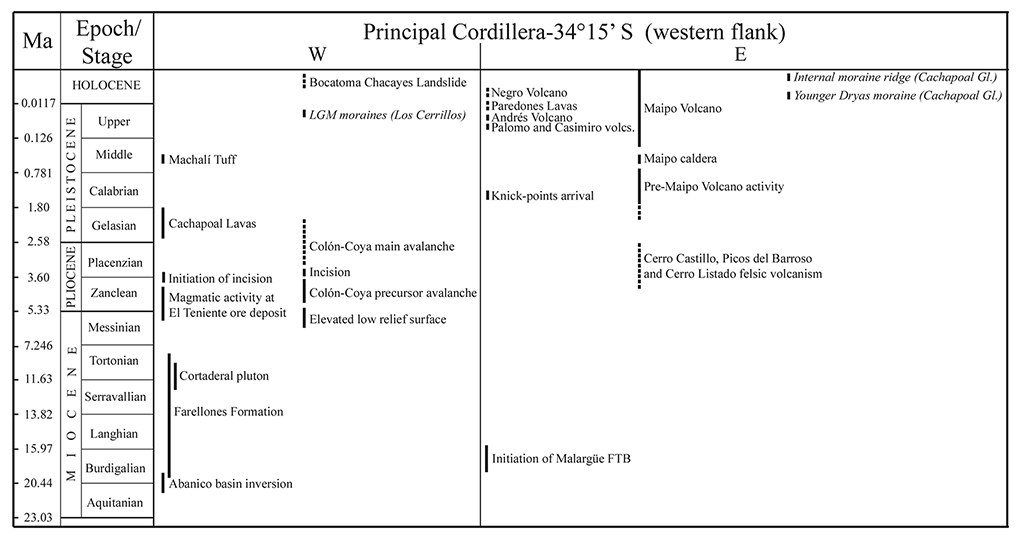 Volcanism in latest Miocene to early Pleistocene, in the Principal Cordillera in central Chile, developed along two swaths: one, in the western Principal Cordillera, and the other along the axis of the mountain range. In the eastern swath, in the highest part of the mountain range, the volcanic deposits covered areas not yet affected by valley incision, whereas in the western Principal Cordillera, pre-late Pliocene avalanches, like the main Colón-Coya Avalanche and early Pleistocene lavas flowed in already deeply incised valleys.