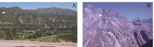 The El Diablo fault is the major fault in this region, separating the Cenozoic units, to the west, from the Mesozoic units, to the east (Fig. 3C). This causes a major change in the general aspect of landscape in the Principal Cordillera between the more abrupt relief, west of the fault, where volcanic deposits predominate, and the smoother relief, east of it, where softer sedimentary deposits are exposed. This is particularly evident between ~33º20’ and 34º15’ S, in the Maipo catchment, where the Principal Cordillera extends more to the east than further south.
