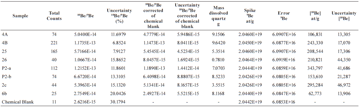 Crushing, mineral separation and sieve of the samples to isolate the 0.5-1 mm fraction was made at the Laboratorio de Separación de Minerales at the Departamento de Geología, University of Chile. Previous to the quartz separation, thin sections were made on 3 of them to ensure obtain enough quartz and pyroxene to perform the analyses. Quartz separates were processed at the CEREGE laboratory, Aix-en- Provence, France. The quartz surface was etched by successive HCl, H2SiF6 and HF leaching. Pure quartz was spiked with 9Be carrier [ASTER in house carrier solution (9Be)=3025±9 µg/g, uncertainty on Be concentration: 0.298% (Merchel et al., 2008)], and then dissolved with HF. Acetyl acetone was used to complex Beryllium in a 50% EDTA solution. Beryllium hydroxides were extracted using solvent (Braucher et al., 2015). They were dried and oxidized at 800 °C to produce BeO. The measurement of 10Be/9Be ratio was carried out at ASTER the French Accelerator Mass Spectrometer located at CEREGE. Data were normalized directly against a house standard STD-11 with an assigned 10Be/9Be ratio of (1.191±0.013)·10-11 (Braucher et al., 2015) and a 10Be half-life of (1.36±0.07)·106 years (Chmeleff et al., 2010). For the exposure ages the production rates of Desilets et al. (2003, 2006), Dunai (2001), Lifton et al. (2005), and Lal (1991)/Stone (2000) were used. The CRONUS v2.3 calculator was used to compute ages and uncertainties (cf. Balco et al., 2008) and a correction for the topographic shielding has been included. The uncertainties include internal uncertainty, blank correction and uncertainty on production rate. The computed ages assume zero erosion. Analytic results are given in Table 1 and the obtained ages are given in tables 2 and 3.
