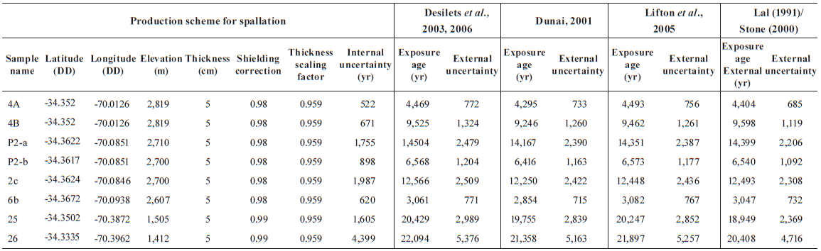 27.2 and 2.3 ka, considering the associated errors (Table 3), and the ages are consistent with the relative age of the sampled moraines according to their location in the drainage basin and at the sides of the present-day Cachapoal glacier. We consider next the ages obtained with the production model proposed by Lifton et al. (2005) in order to compare ages obtained with the same production model (Table 3).