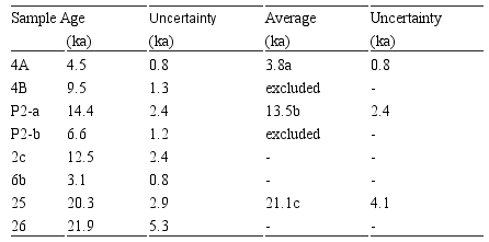 The ages obtained for the dated ridge at Los Cerrillos (samples 25 and 26) are: 20.3±2.9 and